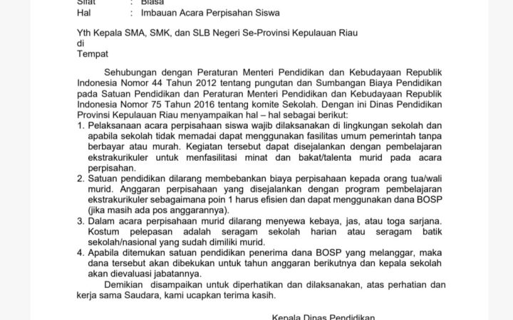 Disdik Kepri Tegaskan Larangan Pungutan dan Kemewahan Acara Perpisahan Siswa