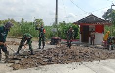 Babinsa Bantu Kerja Bakti Pengelupasan Aspal untuk Persiapan Pengecoran Jalan