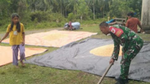 Buol – Peran aktif aparat kewilayahan dalam mendukung sektor pertanian kembali ditunjukkan oleh Babinsa Koramil 1305-07/Bunobogu. Pada Jumat (3/4/2026), Babinsa Serka Taufik S. melaksanakan kegiatan ketahanan pangan (Hanpangan) dengan membantu proses penjemuran jagung milik warga di Desa Taat, Kecamatan Gadung, Kabupaten Buol.