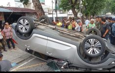 Nabrak Pohon Mobil Sedan KIA, BK 1527 OD Terguling di Jalan Putri Hijau Medan
