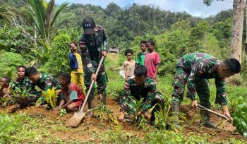 Sambut Ajaran Baru, Satgas Yonif 143/TWEJ Bersama Siswa SD Darurat Adakan Gotong Royong
