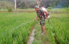 Cegah Hama Tanaman, Babinsa Koramil 04 Dondo Bantu Petani Semprot Padi