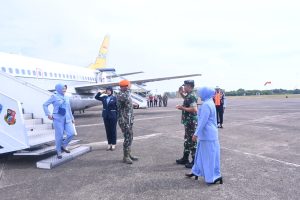 Makassar – Komandan Lanud Sultan Hasanuddin Marsma TNI Arifaini Nur Dwiyanto, M.Han., didampingi Ketua PIA Ardhya Garini Cabang 7/D.II Ny. Betty Arifaini Nur Dwiyanto, menyambut kedatangan Panglima Korps Pasukan Gerak Cepat (Pangkorpasgat) Marsdya TNI Deny Muis beserta rombongan di Baseops Lanud Sultan Hasanuddin, Kamis (28/8/2025).