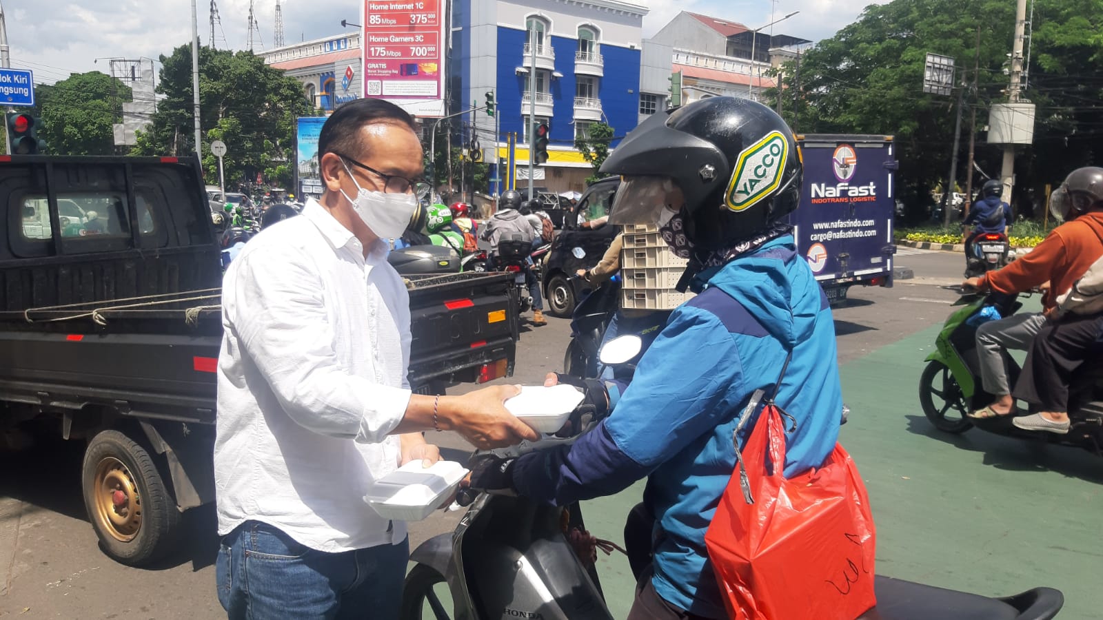 Jakarta – Bertempat di Perempatan Lampu Merah Raden Inten Mc.Donald (BKT) Jakarta Timur Jumat 7/1/2021. DPD KGBN (Kawan Ganjar Bersatu Nasional) Jakarta Timur Mengadakan Acara Jumat Berkah Peduli dengan membagikan 150 Nasi Bok, sabun dan Altis sanitiser kepada para pengendara ojek, supir bajaj, angkutan umum, pendorong gerobak, pemulung serta orang-orang yang membutuhkan.