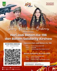 Dalam rangka memperingati Hari Jadi Batam (HJB) ke-196, Pemerintah Kota Batam mengajak seluruh masyarakat untuk hadir dan berpartisipasi dalam Batam Solidarity Airshow 2025, sekaligus menyalurkan donasi bagi saudara-saudara kita yang terdampak bencana di Aceh, Sumatera Utara, dan Sumatera Barat.
