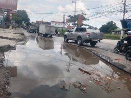 Pekanbaru – Jalan Dharma Bakti, Kelurahan Bandar Raya, Kecamatan Payung Sekaki bak kolam dengan genangan dan lobang yang cukup besar. Pantauan lapangan, Selasa (6/5) siang, jalan tersebut tergenang air akibat adanya drainase yang tersumbat.