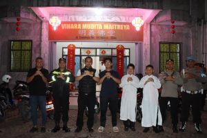 DUMAI – Kapolres Dumai AKBP Angga Febrian Herlambang, S.I.K., S.H., melakukan pengecekan langsung terhadap situasi keamanan dan ketertiban masyarakat (kamtibmas) saat pelaksanaan ibadah malam Tahun Baru Imlek 2577 Kongzili/2026 M. Kegiatan berlangsung pada Senin (16/2/2026) sekitar pukul 20.00 WIB di Vihara Mudita Maitreya, Jalan Kamboja No.101, Kelurahan Dumai Kota, Kecamatan Dumai Kota.