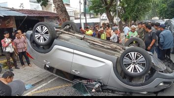 Medan – Satu unit mobil jenis sedan warna silver nomor polisi BK 1527 OD, terguling hingga rodanya ke atas di Jalan Putri Hijau Medan Barat, Selasa (16/9/2025) siang.