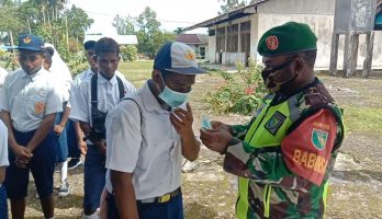 Numfor Timur – Sebagai upaya pencegahan Covid-19 kepada generasi, Babinsa Koramil 1708-05/Numfor, Kodim 1708/BN, membagikan masker secara gratis kepada Pelajar SMP N 1, Distrik Numfor Timur, Senin (24/01/2022).