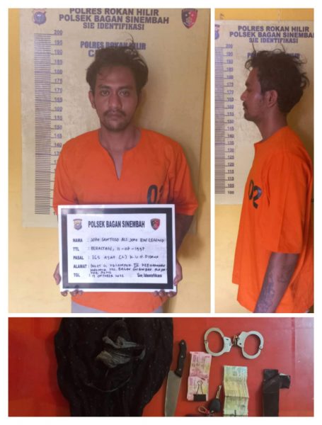 [vc_row][vc_column][vc_column_text]Rohil, Riau – Laki-laki bernama Joko Santoso (25 Thn) Alamat Paket G Kelompok IV Kepenghuluan Harapan Makmur Kecamatan Bagan Sinembah Kabupaten Rokan Hilir ( Rohil) dijebloskan ke sel tahanan Polsek Bagan Sinembah Polres Rohil. Selasa 18/10/2022, Pukul 19.00 WIB.