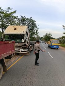 Petugas Piket Batara Biru Polsek Batu Aji kemudian bergerak cepat menuju tempat kejadian perkara (TKP). Setibanya di lokasi, petugas langsung melakukan pengaturan dan penertiban arus lalu lintas guna mengurai kemacetan serta memastikan keamanan dan kelancaran pengguna jalan.