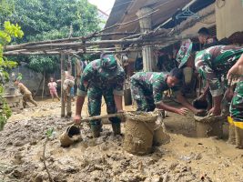 Pidie – Prajurit TNI dari Batalyon Infanteri Teritorial Pembangunan (Yonif TP) 857/Gana Gajahsora melaksanakan kegiatan kemanusiaan dengan membantu membersihkan rumah seorang lanjut usia (lansia) yang terdampak banjir di Gampong Adan, Kecamatan Mutiara Timur, Kabupaten Pidie, Kamis (18/12/2025).