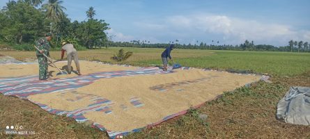 Dalam kegiatan tersebut, Serda Herman membantu Bapak Nure, seorang petani setempat, menjemur hasil panen padi agar cepat kering dan kualitasnya tetap terjaga. Proses penjemuran menjadi tahap penting sebelum padi dimasukkan ke dalam karung, sehingga tidak mudah busuk atau berjamur.