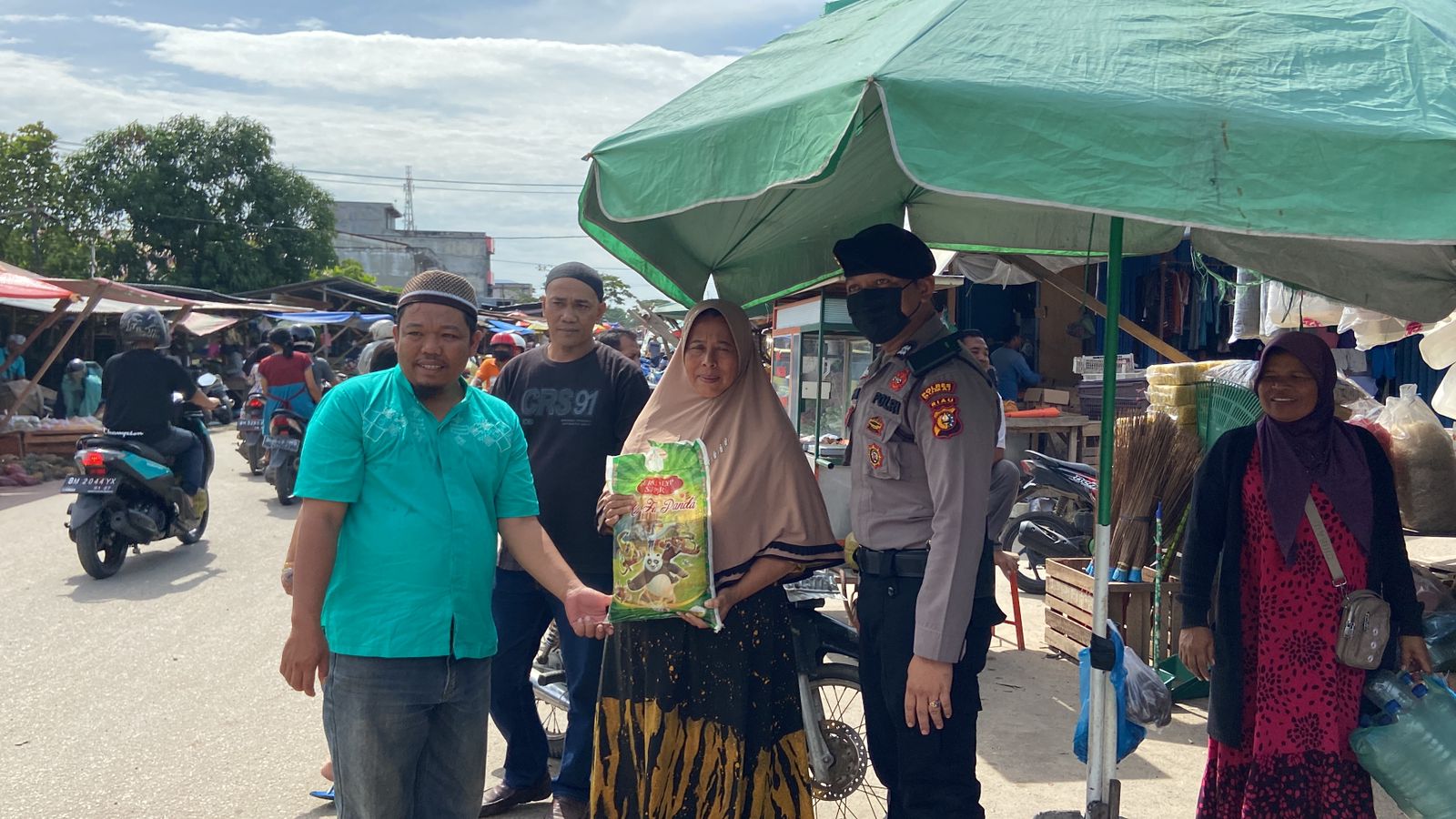 Selanjutnya, di Jalan Swadaya RT 01 Kelurahan Bukit Batrem turut dibagikan kepada lima KK, serta di sepanjang jalan di depan Kantor Polres Dumai kepada pedagang.