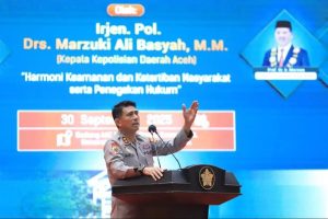 Banda Aceh — Kapolda Aceh Irjen Pol. Marzuki Ali Basyah tampil sebagai pembicara dalam kuliah umum di Universitas Syiah Kuala (USK) yang digelar di Gedung AAC Dayan Dawood, Selasa (30/9/2025). Acara yang dihadiri ratusan mahasiswa lintas fakultas ini mengusung tema “Harmoni Keamanan dan Ketertiban Masyarakat serta Penegakan Hukum.”