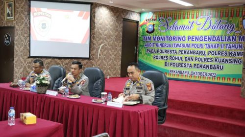 [vc_row][vc_column][vc_column_text]Pekanbaru – Lakukan giat Monitoring dan Pengendalian Mutu Audit Kinerja Tahap II TA 2022, Tim Itwasum Mabes Polri yang dipimpin langsung oleh Kombes Pol Andi Syahrifah Taufik, S.I.K., M.Si, smabangi Polresta Pekanbaru, Selasa (25/10/2022) pukul 14.00 WIB.