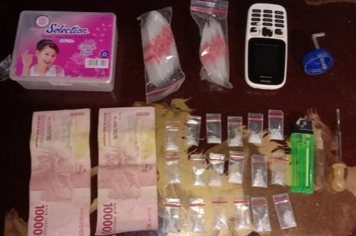 Dari KW(34) Tim berhasil menemukan barang bukti berupa 18 (delapan belas) bungkus plastik klip transparan yang didalamnya berisi diduga narkotika jenis shabu2 dgn berat brutto 3,88 gram, 1 (satu) unit handphone merk Nokia warna putih, 2 (dua) bundel plastik klip kosong, 1 (satu) tutup botol dan pipet plastik bengkok untuk menghisap shabu2, 1 (satu) buah mancis, 1 (satu) kaca pyrex, 1 (satu) kotak cotton bud, Uang Rp. 200.000,-