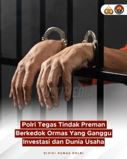 “Polri menegaskan akan tegas menindak oknum organisasi masyarakat (ormas) yang terlibat dalam premanisme dan menghambat investasi di Indonesia,” ucap Kadiv Humas Polri Irjen Pol. Dr. Sandi Nugroho. S.I.K., S.H., M.Hum.